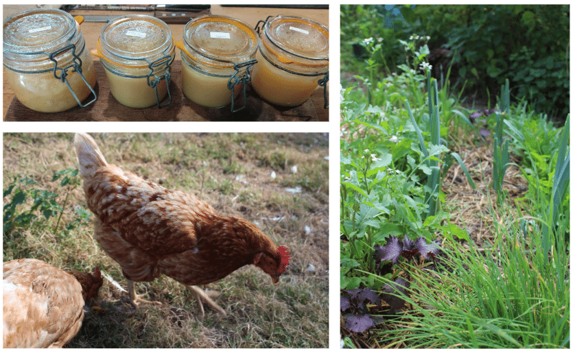 – l’une paysanne : nous essayons autant que possible de produire et de construire un maximum par nous-mêmes. Nous faisons donc de la conservation alimentaire (pasteurisation, séchage, lactofermentation, fabrication de fromages), de la construction avec des matériaux bio-sourcés, du soin aux animaux (poules, lapin, cochon d’inde et canards), des
